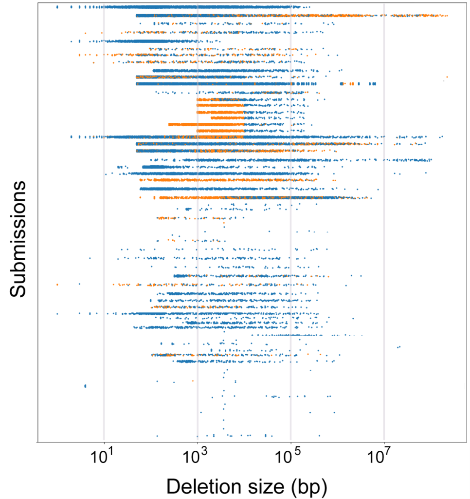 Figure 1: Sizes of copy number loss variant calls. Each dot represents a CNV loss call. Each row corresponds to a submission (only part of the