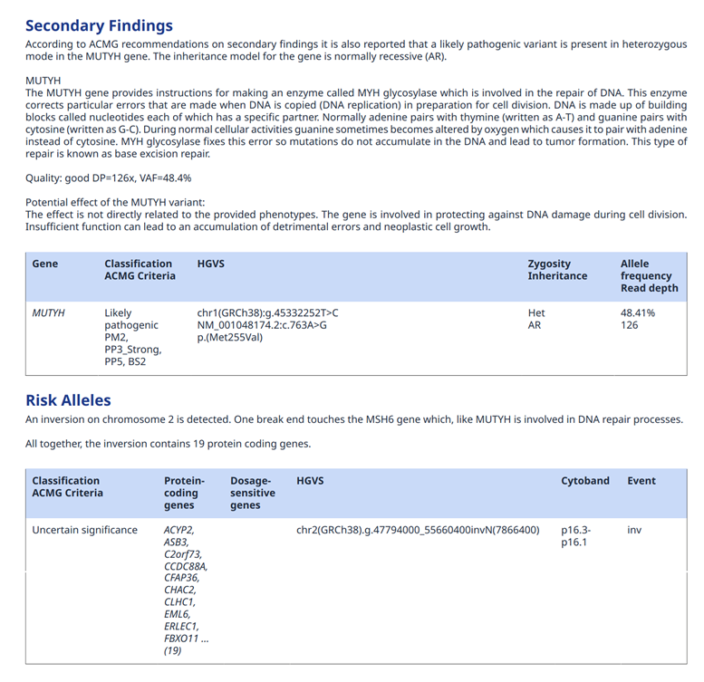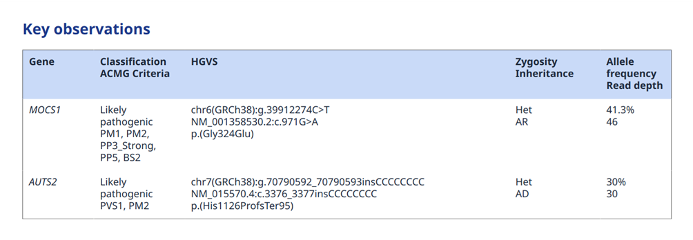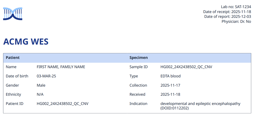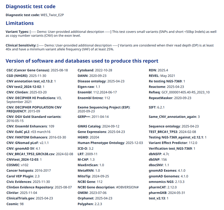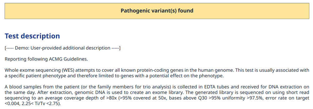 The report will then contain test result data organised into different sections. Firstly, the molecular sample preprocessing methodology, the sequencing itself, and the bioinformatic post-processing as well as variant interpretation shall be described enough to convey a general understanding of its overall power as well as limitations.