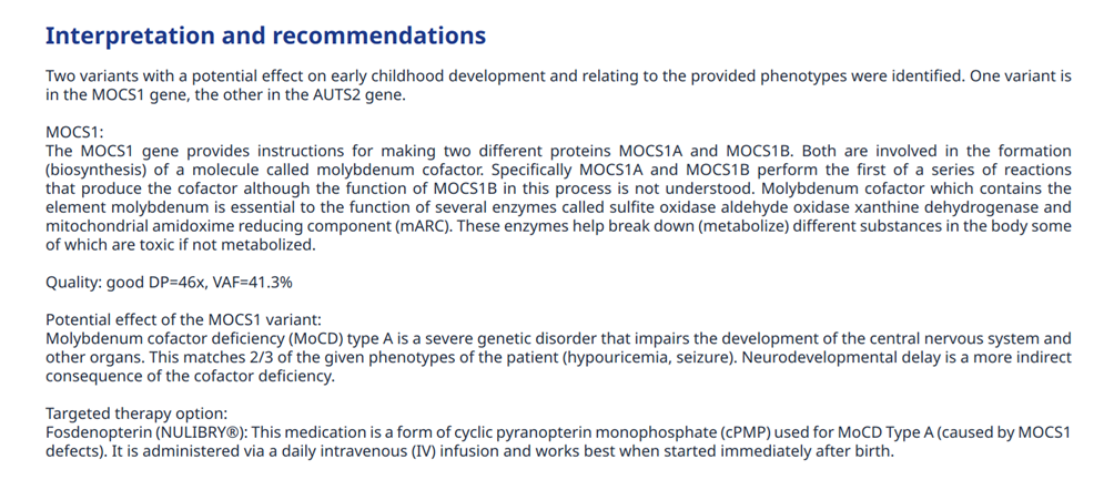Report generation for a genetic diagnostic test compiles the interpreted results into a formal document. There will be the primary results, but possibly also secondary findings, carrier information, or variant risk alleles. The target reader can be either the patient itself, and/or the medical professional, in which case there will be differently adapted content. The date of the document will be indicating when it was created or became effective, and possibly implicitly or explicitly talk about update (see databases below). The document will contain information about the patient, the orderer of the test, the source of the biological material used, the test itself and the reason for applying it to the patient (Fig.2, example from the omnomicsNGS reporting system).