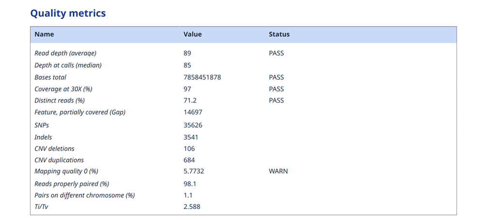 Not only the quality of the wet lab work, DNA purification, library construction are critical; also the sequencing itself and the ensuing data analysis are. Computational tools are used to identify the divergence from the reference genome by using the measurement raw data. It takes a few critical bioinformatic software procedures to convert the raw sequence data to a list of identified variants. Some of the computational steps are heuristic, meaning that the alignment and variant calling is proceeding by trial and error or by rules that are only loosely defined. By applying strict and comprehensive quality control it is possible to ensure that the identified genetic variants can be trusted and that the absence of variants does not just depend on a badly covered region during sequencing. A good report will include relevant metrics to document the correctness of the procedure of the genetic test.
